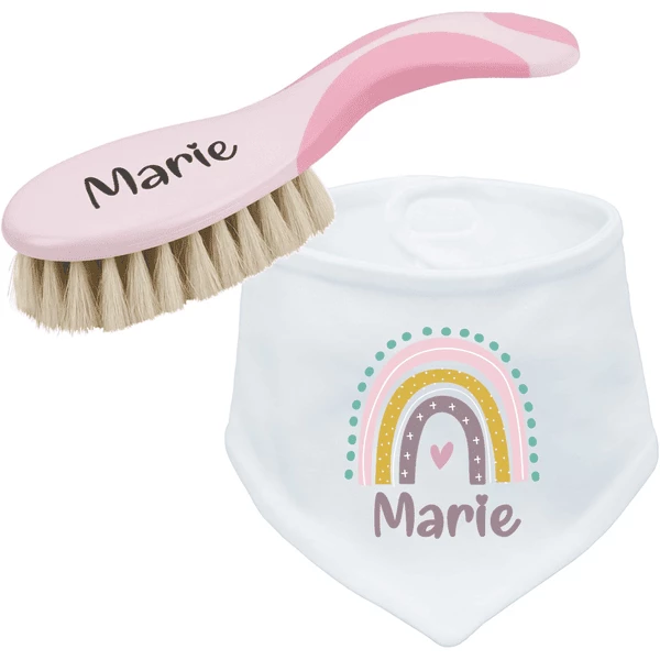 - Geburtsgeschenk für einen Jungen oder Mädchent: 1 x Original NUK Babybürste mit Namen in Blau oder Rosa 1 x Baby Halstuch mit Namen bedruckt – Rainbow