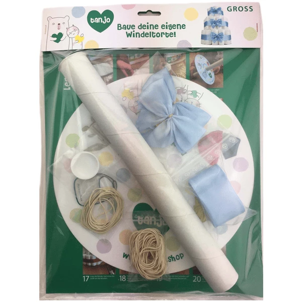 Mit dem Tanjo Windeltorten Bausatz kannst du ganz einfach eine wunderschöne Windeltorte selbst herstellen. Bestelle dir dein DIY Set in einer Farbe und Größe deiner Wahl. Zur Auswahl stehen rosa, hellblau und grün – in klein, mittel oder groß.Der DIY Bausatz für die blaue große Windeltorte enthält: – Tanjo Windeltortenboden- stabile Papphülse mit Deckel- Bänder und Schleifen inkl. Klebepunkte- Alle notwendigen Gummis zur BefestigungDu brauchst nur noch:- 2 Packungen Windeln z.B. Öko Natur oder eine andere Windelart deiner Wahl in Größe 3Mit Hilfe eines Tackers und einer Schere erstellst du dir ganz einfach deine Windeltorte. Mit Produkten deiner Wahl kannst du deine Torte individualisieren. Das Beispielbild dient zur Inspiration.