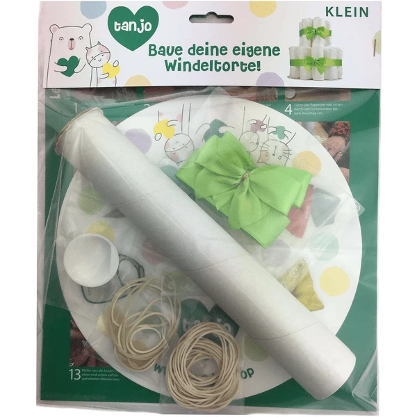 Mit dem Tanjo Windeltorten Bausatz kannst du ganz einfach eine wunderschöne Windeltorte selbst herstellen. Bestelle dir dein DIY Set in einer Farbe und Größe deiner Wahl. Zur Auswahl stehen rosa, hellblau und grün – in klein, mittel oder groß.Der DIY Bausatz für die kleine grüne Windeltorte enthält: – Tanjo Windeltortenboden- stabile Papphülse mit Deckel- Bänder und Schleifen inkl. Klebepunkte- Alle notwendigen Gummis zur BefestigungDu brauchst nur noch:- 2 Packungen Windeln z.B. Öko Natur oder eine andere Windelart deiner Wahl in Größe 3Mit Hilfe eines Tackers und einer Schere erstellst du dir ganz einfach deine Windeltorte. Mit Produkten deiner Wahl kannst du deine Torte individualisieren. Das Beispielbild dient zur Inspiration.