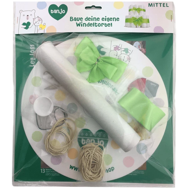 Mit dem Tanjo Windeltorten Bausatz kannst du ganz einfach eine wunderschöne Windeltorte selbst herstellen. Bestelle dir dein DIY Set in einer Farbe und Größe deiner Wahl. Zur Auswahl stehen rosa, hellblau und grün – in klein, mittel oder groß.Der DIY Bausatz für die mittlere rosa Windeltorte enthält: – Tanjo Windeltortenboden- stabile Papphülse mit Deckel- Bänder und Schleifen inkl. Klebepunkte- Alle notwendigen Gummis zur BefestigungDu brauchst nur noch:- 2 Packungen Windeln z.B. Öko Natur oder eine andere Windelart deiner Wahl in Größe 3Mit Hilfe eines Tackers und einer Schere erstellst du dir ganz einfach deine Windeltorte. Mit Produkten deiner Wahl kannst du deine Torte individualisieren. Das Beispielbild dient zur Inspiration.